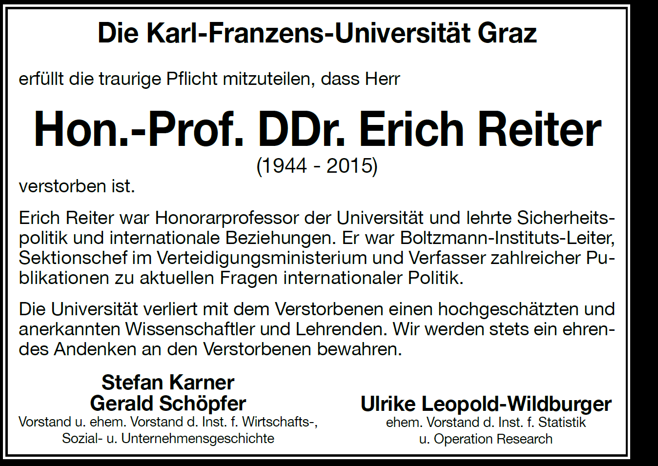 Erich Reiter war Honorarprofessor der Universität und lehrte Sicherheitspolitik und internationale Beziehungen. Er war Boltzmann-Instituts-Leiter, Sektionschef im Verteidigungsministerium und Verfasser zahlreicher Publikationen zu aktuellen Fragen internationaler Politik.