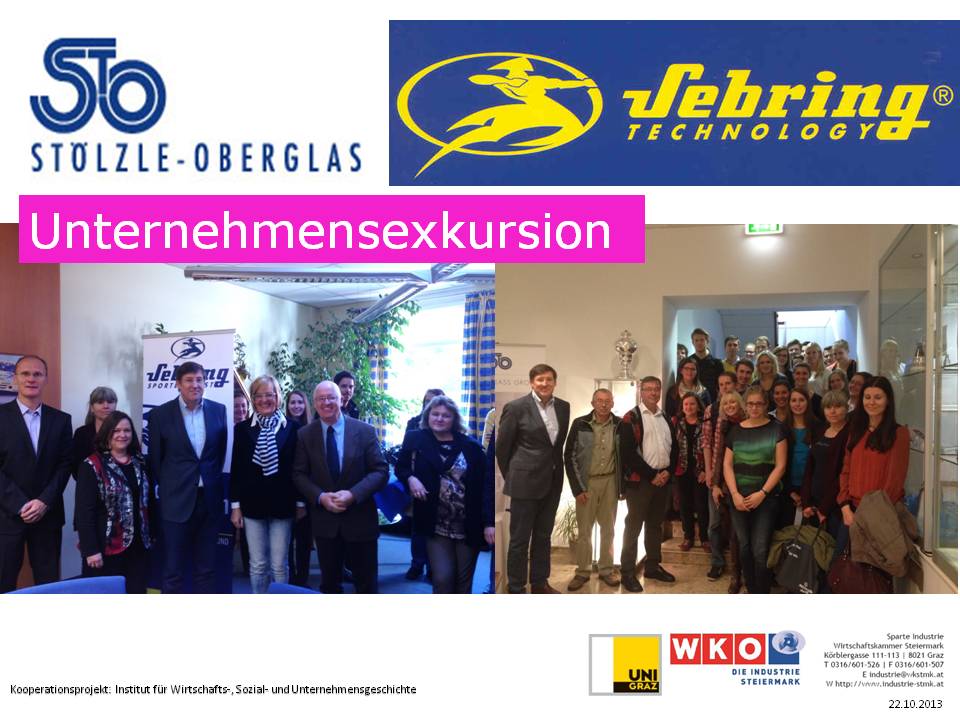 In Kooperation mit der Wirtschaftkammer Steiermark veranstaltete das Institut für Wirtschafts-, Sozial- und Unternehmensgeschichte innerhalb einer gemeinsamen Lehrveranstaltung mit dem Institut für Internationales Management eine Exkursion zur Sebring Technology GmbH und zur Stölzle – Oberglas GmbH nach Voitsberg bzw. Köflach.