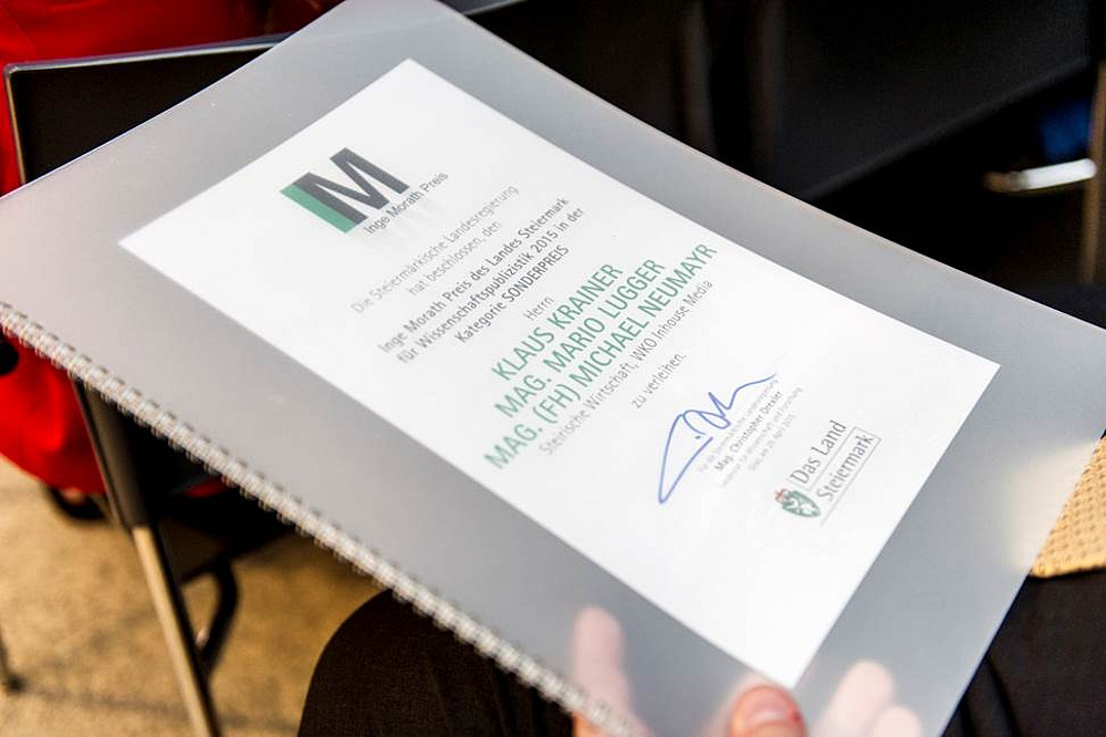 Im Rahmen der Gala anlässlich der Verleihung der Steirischen Wissenschaftspreise in der Messe Graz wurde die Redaktion der "Steirischen Wirtschaft" von Landesrat Christopher Drexler mit dem Inge Morath-Preis für Wissenschaftspublizistik ausgezeichnet. Grund für die Auszeichnung war die Serie "Zeitenblicke - 100 Jahre Wirtschaft in der Steiermark", die von den Redakteuren unter wissenschaftlicher Federführung und Konzeption des Instituts für Wirtschafts-, Sozial- und Unternehmensgeschichte der Karl-Franzens-Universität Graz (gemeinsam mit dem Ludwig Boltzmann-Institut für Kriegsfolgen-Forschung) erarbeitet wurde.